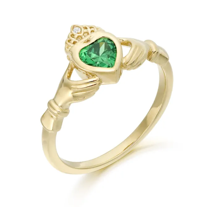 9ct Gold CZ Emerald Claddagh Ring. The Claddagh is Ireland’s everlasting commemoration of friendship, loyalty, and love. This ladies Claddagh Ring pays attention to details, style and craftsmanship to this timeless symbol with its figurative representation which makes this Claddagh Ring stylish, unique and timeless piece of Irish Jewelry. Available in sizes I-S.