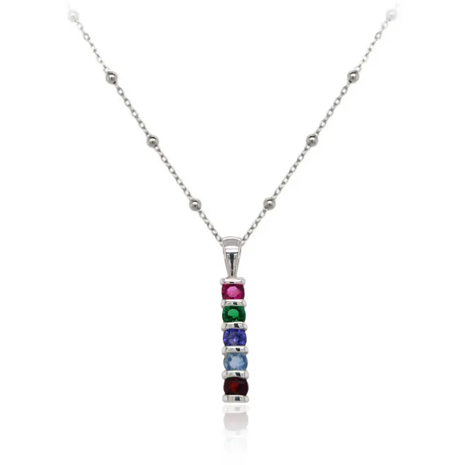 This elegant family birthstone bar necklace in 9 carat white gold celebrates each loved one with personalized beauty. The necklace features a unique pendant design that holds up to 5 sparkling birthstones, each representing a cherished family member. Please note all stones are synthetic. Ideal for everyday wear, this necklace is not only a stunning accessory but also a meaningful keepsake, making it a perfect gift for mothers, grandmothers, or anyone who treasures family connections.