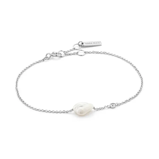 The everyday way to do pearls, choose a delicate chain bracelet finished with our signature baroque fresh water pearl. A unique and asymmetrical shape pearl is flanked by a single cubic zirconia stone for just enough sparkle. Perfect for stacking with chains or bangles or wearing solo as the main event. Also available in Yellow Gold.