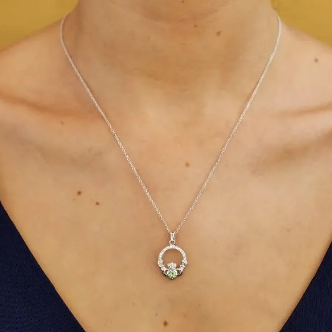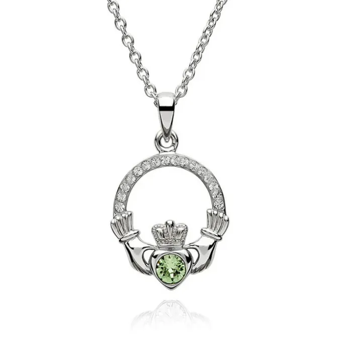 This Beautiful Sterling Silver Claddagh Necklace has a round shaped synthetic PERIDOT stone in the centre of the heart of the claddagh pendant, signaling a AUGUST birthday. The pendants radiates a subtle sparkle from the CZ stones and is presented on a sterling silver chain which can be adjusted between a 16″-18″ length.