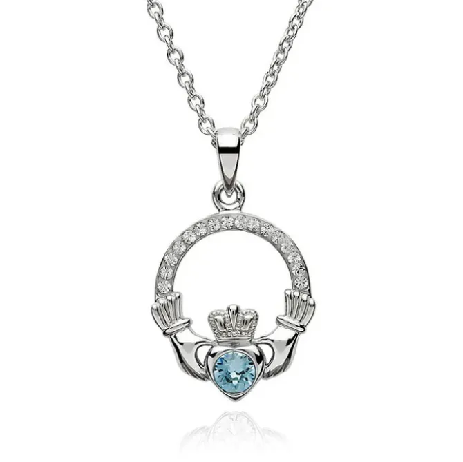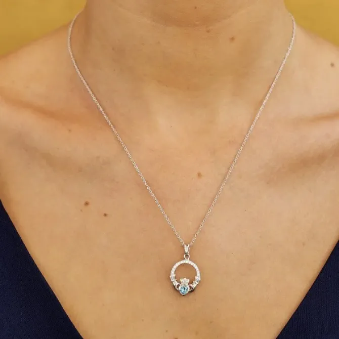 This Beautiful Sterling Silver Claddagh Necklace has a round shaped synthetic AQUAMARINE stone in the centre of the heart of the claddagh pendant, signaling a March birthday. The pendants radiates a subtle sparkle from the CZ stones and is presented on a sterling silver chain which can be adjusted between a 16″-18″ length.