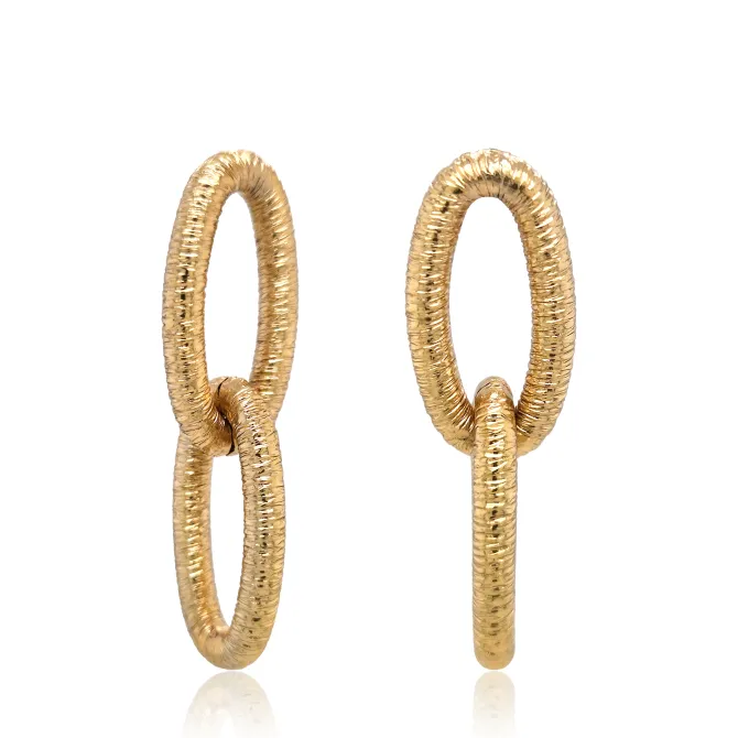 These Rebecca Earrings showcase a unique design with intricate double striped mesh detailing in radiant yellow gold. These elegant earrings combine texture and shine, making them a sophisticated addition to any jewelry collection.