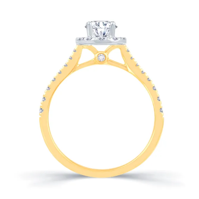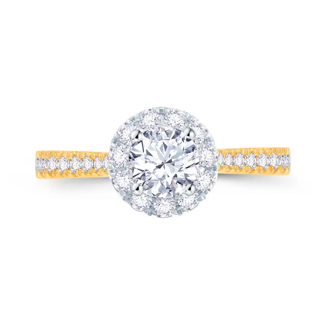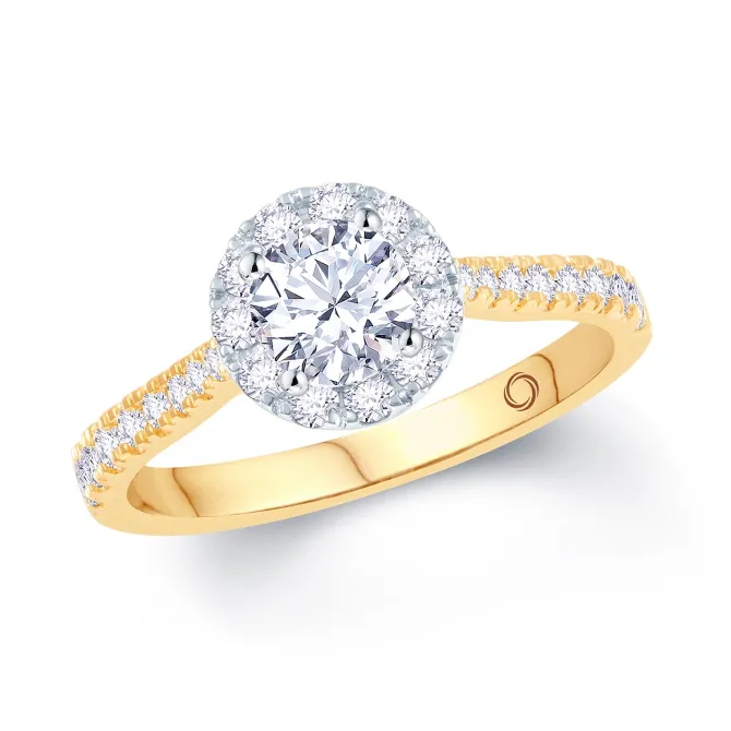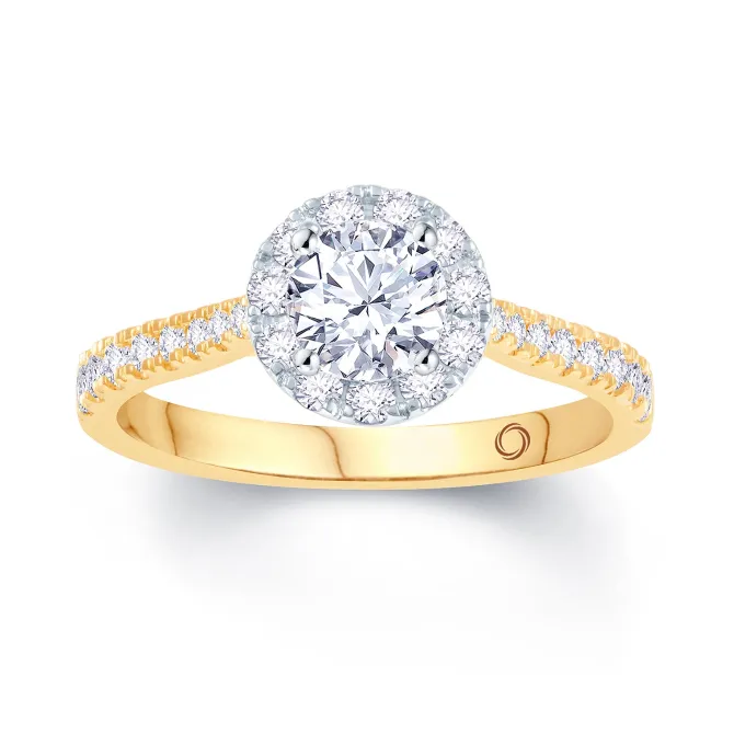 Shop our beautiful “RUTH” 18ct Yellow Gold, Round Brilliant Cut and Diamond Halo Engagement Ring with sparkling diamond set shoulders. A classic and timeless style to love forever.