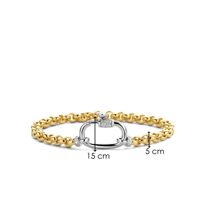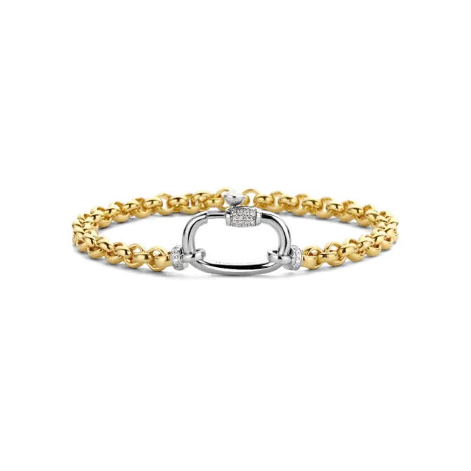 This TI SENTO rolo chain silver bracelet has a stream of gold-plated links. Its large silver safety lock is decorated with zirconia pave and a mother of pearl stone, becoming the opulent centrepiece of this vintage design.