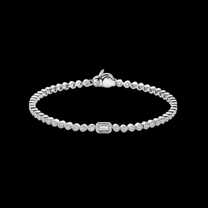 Embrace timeless charm with this TI SENTO Silver Tennis Bracelet. Crafted from 925 sterling silver and plated with platinum for lasting brilliance, this bracelet features a dazzling row of white cubic zirconia stones. The white cubic zirconia stones, including a central, elongated baguette-cut stone, create a captivating romantic effect. The clean lines and pure brilliance of the cubic zirconia stones make it a versatile piece that effortlessly elevates any outfit. Let this bracelet be the foundation of your Necklace and Earrings.