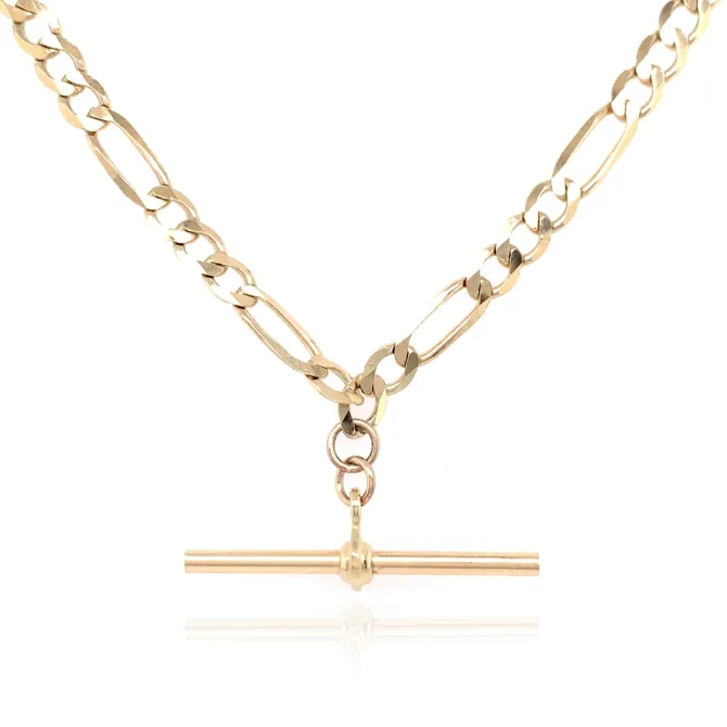 A beautiful 9ct Yellow Gold T-Bar Necklace with a combination of the classic Figaro and Belcher style chain. The Necklace is 18″ in length with an Albert Clasp for easy closure.
